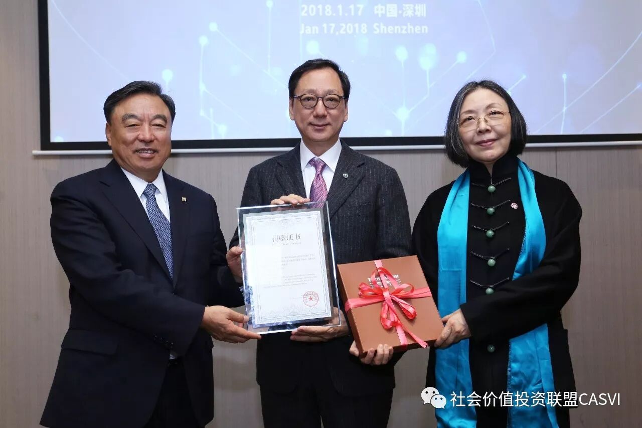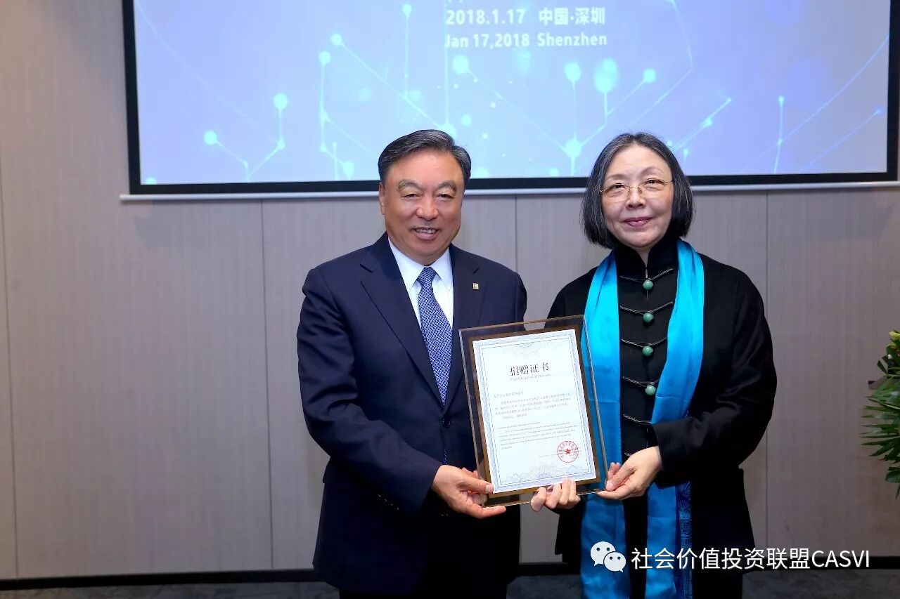 感谢友成企业家扶贫基金会2017年为社投盟捐赠了631.13万元,图为马蔚华主席为创始主席、友成企业家扶贫基金会理事长王平女士授予捐赠证书。