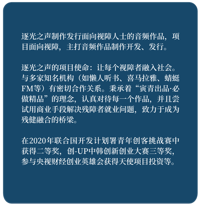 发表时间:2022-03-14 23:42 假如给你三天“黑暗”, 你要如何绕开四处磕碰的桌角? 你要如何走过弯曲而不平整的道路? 你要如何躲避马路上飞驰的车辆? …… 假如给你三天“无声”, 你要如何不错过每一个重要的电话通知? 你要如何在听不到喇叭与提醒的情况下出门买东西? 你要如何在与人交流时及时做出反应? …… ![]() 图源网络:常常被占用的盲道 目前,中国已有约1700万人陷入黑暗,约2780万人陷入无声, ta们经常因为残障而被他人“看到”,周围的人群自动隔开一道边界,因为ta们和大家“不太一样”; ta们也因为残障而被他人“忽视”,巨大的边界让人看不清也听不清ta们的内心,ta们逐渐变成了行走在城市边缘的“隐形人”。 然而,却有这样一群人,看到了身上肩负的使命, ta们坚信自己能为社会中的“无障碍”做出更多的贡献,帮助残障人士更好地融入社会。 ta们走到了大众面前,要擦除这道世俗的边界,告诉大家,“我们可以做到更多特别的事。” 本次社企会客厅,我们邀请到了音书科技的创始人石城川先生和逐光之声的创始人马寅青女士。作为曾经在城市边缘的“隐形人”,他们经历了残障人群在日常生活、学习、工作中所经历的各种困境,深刻意识到自身改变残障人群现状的使命并毅然创业,一直在发展“无障碍”的道路上坚定向前。 石城川 音书科技创始人 ![]() “不管是曾经,还是如今和未来,我们想做的事情以及目的都是一样的——帮助听障人士更好地沟通,从而更好地生活和工作,更好地融入社会。” ![]() 马寅青 逐光之声创始人 ![]() “许多捐助都只是解决短期问题且存在不确定风险,所以只有让视障人群有一技之长,才能可持续地让他们过得更好、更有尊严。” ![]() #1“聋”与“盲”,隔离了我们的世界听不见,就努力去“看” “对听障人士来说,最大的问题是沟通障碍,这一问题会导致我们融入社会很困难。” 在采访中,石城川先生向我们介绍了当初创立音书科技的一些想法与经历。“我11岁的时候因为生病导致听力障碍,我双耳的听力都是120分贝。”石城川解释说,120分贝指的是听力损失120dBHL(dBHL:Decibel Hearing Level,听力损失程度*)。一般情况下,听觉系统的结构和功能方面极重度损伤,较好耳平均听力损失≥91dBHL,这已经达到了听力残疾一级的程度。这个级别中的听障人士,在无助听设备帮助下,不能依靠听觉进行言语交流,在理解和交流等活动上极度受限,在参与社会生活方面也可能存在严重障碍。 ![]() 倔强的他不仅没有“留级”,还拒绝进入聋哑学校就读,坚持和普通孩子一起上课。听不见课,就努力去“看”。他通过看老师口型、板书、复习笔记,加上自身的天赋与惊人的努力,最终以高于一本线41分的成绩被暨南大学录取,并且还成功获得了学校“自强不息之星”称号与“中国大学生十大感动人物”提名。 ![]() 石城川 “我还一直很想为我们这样的听障人群做点事情,”面前的石城川带着淡淡的笑容,“家人对我的处境感同身受, 也一直相信我能为听障群体做贡献,他们也特别支持。” 声音为步,可以追逐光明 1994年,马寅青出生于上海,因早产导致双目失明,声音成为她了解身边世界最主要的途径。 “小时候我特别喜欢听收音机,因为觉得这个是获取信息很重要的方式。那个时候经常听动感101,因为能听音乐,广播剧最早是听刑警803,后来到小学住校,晚上就躲在被子里面听‘张震老师讲故事’。” 马寅青说到自己如何“爱上声音”的时候总是滔滔不绝,“从小我就对声音这一表现形式有很大兴趣,在盲校时我参加了话剧社,后来跟着朋友一起玩配音,也尝试做过兼职主播,这些都为我进入这个领域打下基础。” ![]() 马寅青 “父母总认为女孩子,视力又有障碍,进医院当推拿师才是最稳定、最好的选择。但是我在学习和实习的过程中,我发现自己并不适合这个专业。” 马寅青在大学里第一次接触了有声读物,也顺利完成了自己第一次配音的广播剧,这无意间点燃了她新的热爱,“我当时配音的角色是个小女孩,虽然内容不多,收入也只有几十块钱,但至少我知道了这个是可以获得收入的。对于视障人士,我们的选择其实很少很少。人们一想到视障人群,就是推拿和按摩,可我不想做这些,我的梦想要用声音才能实现的。” 有了第一次的尝试,马寅青更加确定自己对有声书的热爱,“我心里很清楚自己喜欢的是什么,让我学不喜欢的东西,我是根本不能静下心来学的。但是对于广播剧录音,我一直在坚持,因为我确定它是我很喜欢的东西。” #2把喜欢的事情做成职业很幸福社创号 可以与我们分享一下您的创业初心吗? 石城川 根据中残联的统计,我国的听障人士群体约有7200万人,其中达到听力残疾级别的有2780万人,而助听器与人工耳蜗却因为产品价格较高和自身局限渗透率极低,听障设施处于一片空白。 听障人士常常需要无声地面对难以接受优质教育、失业、经济负担、没有同伴等问题。直到2012年,我注意到谷歌公司发布一款智能眼镜,让我萌生了一个特别的想法。如果能将说的话变成文字,听障人士就能够更顺畅地与普通人交流了。于是我辞掉工作,创办了音书科技。 ![]() 石城川在展示音书科技APP 专门面向听障群体做智能眼镜产品,从单纯商业角度而言可能不算是一个有巨大潜力的项目,但确实是一个很有社会价值的想法。 马寅青 目前,全国大约